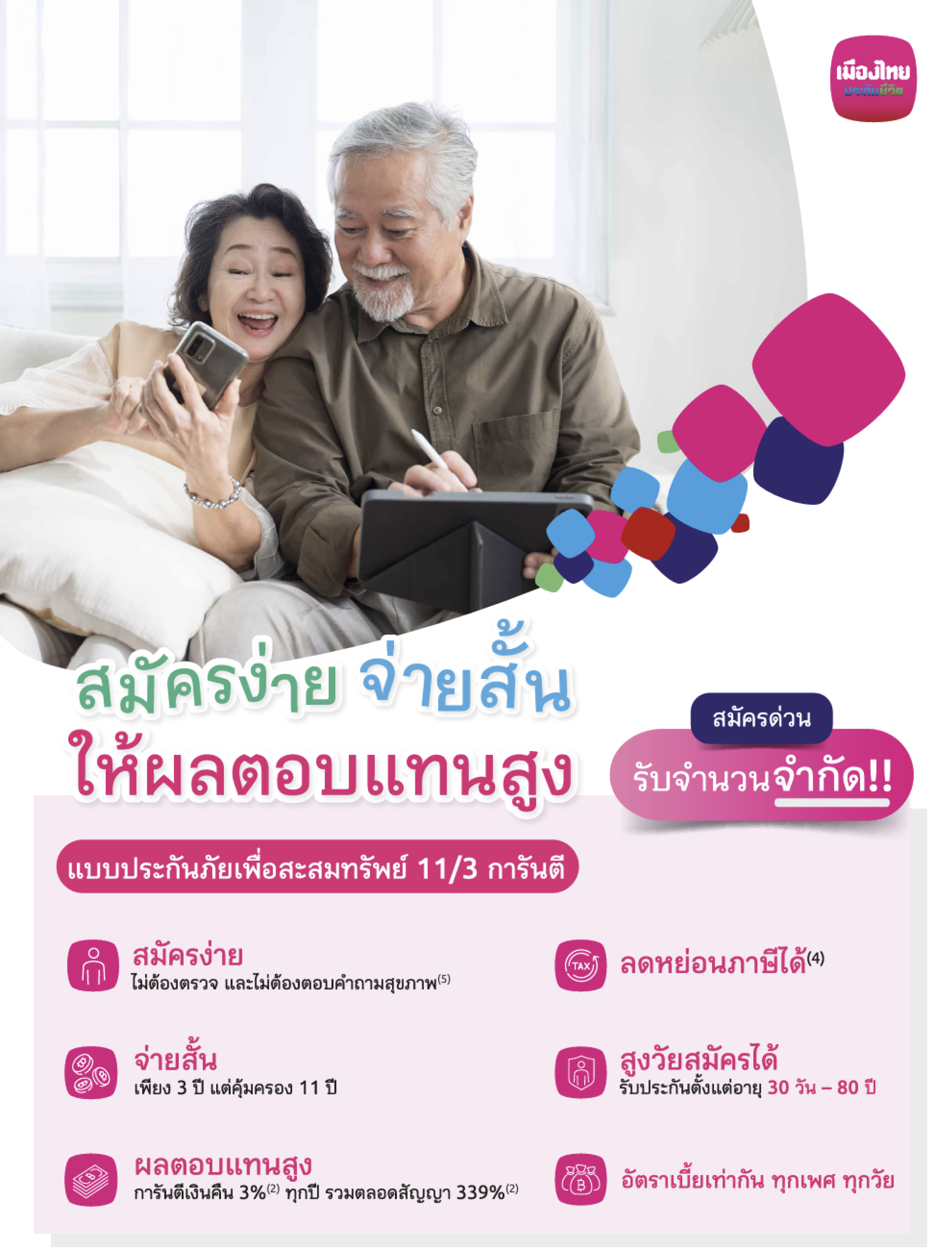 - สูงวัยก็สมัครได้ อัตราเบี้ยเท่ากันทุกช่วงอายุ