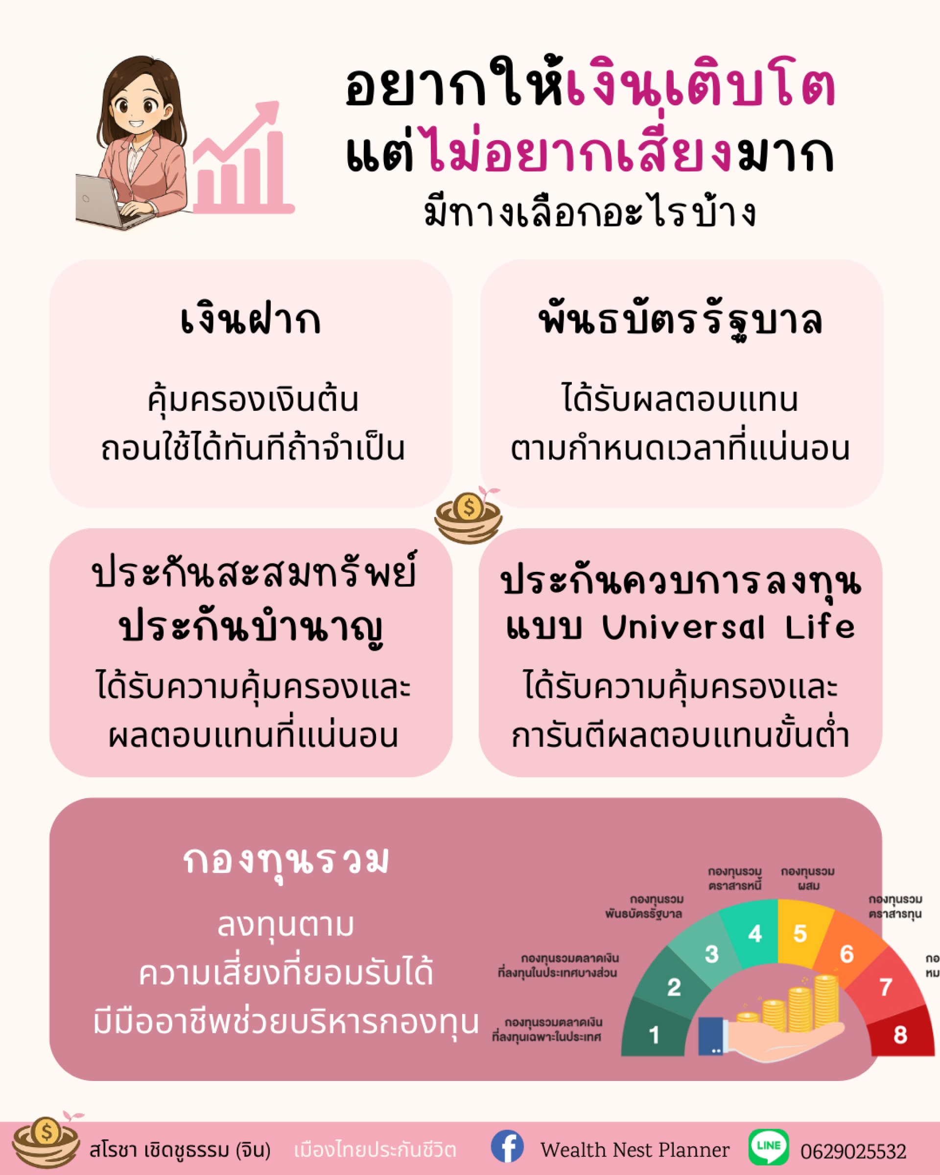 แม้เครื่องมือการเงินเหล่านี้จะ เสี่ยงต่ำ แต่สิ่งสำคัญคือการเลือกให้สอดคล้องกับ เป้าหมายชีวิต และ ระดับความเสี่ยงที่ยอมรับได้ เช่น